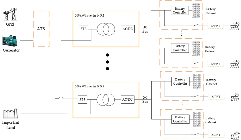 1. W przypadku obciążeń przekraczających 500 kW zaleca się stosowanie jednojednostkowego falownika magazynującego energię o dużej mocy 500 kW, który jest w stanie obsłużyć do czterech zestawów połączeń równoległych, uzyskując łączną moc wyjściową 2 MW;